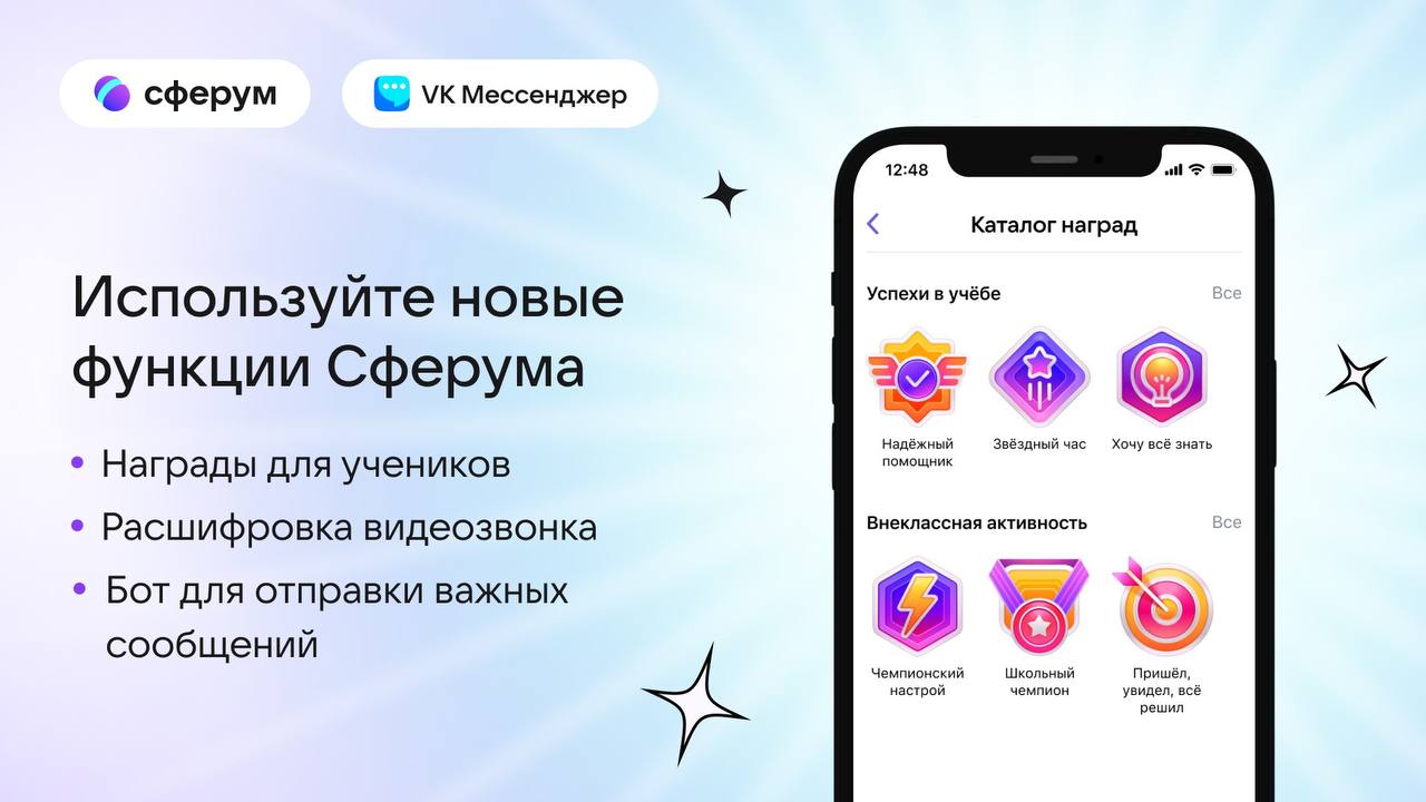 09.01.2024Сферум представил новые функции для педагогов, родителей и учащихся. В учебном профиле Сферум в VK Мессенджере появился раздел «Награды», благодаря которому педагоги смогут мотивировать и поощрять школьников за достижения в учебе, спорте и внеучебной деятельности. Пользователям Сферума стала доступна расшифровка видеозвонков, с помощью которой можно оперативно получать текстовые расшифровки педагогических совещаний или родительских собраний. В последнюю версию разработчики также добавили функцию важных сообщений — она поможет не пропустить в учебной переписке нужную и актуальную информацию. НАГРАДЫ ЗА ДОСТИЖЕНИЯ Учителя с верифицированным учебным профилем Сферума в VK Мессенджере могут выдавать награды школьникам прямо в чате класса или личной переписке. Награды будут видны в учебных профилях детей. Награду «Звездный час» можно получить за отличный доклад, «Хочу все знать» — за активную работу на уроке, а «Надежным помощником» может стать тот ученик, который выручил одноклассников. Предусмотрены также специальные знаки отличия для победителей городской олимпиады — «Пришел, увидел, все решил» и обладателей спортивных достижений — «Чемпионский настрой» и «Школьный чемпион» — за активность на уроке физкультуры или победу на спортивном соревновании от лица школы. На старте в Сферуме доступно шесть наград. Каждую ученик может получить один раз, но она навсегда останется в его учебном профиле и будет видна всем пользователям. РАСШИФРОВКА ВИДЕОЗВОНКОВ И ФУНКЦИЯ ВАЖНЫХ СООБЩЕНИЙ Пользователи учебного профиля Сферум в VK Мессенджере могут воспользоваться функцией расшифровки видеозвонков — она будет полезна, если нужно получить протокол педагогического совещания или родительского собрания в текстовом формате. После начала звонка необходимо нажать кнопку расшифровки, а по его окончании файл с текстом придет в чат. Функция важных сообщений позволяет оповестить всех участников чата о сообщении и следить, чтобы все с ним ознакомились. Например, это может быть оповещение о дате проведения родительского собрания или итоговой контрольной. Чтобы воспользоваться этой функцией, необходимо в поле для сообщения в чате ввести три восклицательных знака, затем перейти на новую строку, нажав Shift + Enter, и написать текст. После этого придет уведомление от сообщества «Сферум на связи», которому нужно подтвердить отправку сообщения. «Цифровые инструменты помогают педагогам в организации учебного процесса и снимают с них часть рутинных задач. Функция важных сообщений позволяет не упустить самое необходимое в объемной переписке, а возможность расшифровки видеозвонка — получить текстовый протокол онлайн-совещания или родительского собрания. Кроме того, учеников можно мотивировать не только высокими оценками, но и специальными наградами прямо в Сферуме», — рассказал Рубен Акопов, руководитель сервиса Сферум, VK. Напомним, что учебный профиль Сферум в VK Мессенджере – российский информационно-коммуникационный сервис, предназначенный для образовательных целей и общения учителей, школьников и родителей в едином и защищенном образовательном пространстве. Учебный профиль Сферум является дополнительным цифровым инструментом, который помогает сделать традиционное образование в классе более эффективным и современным, 