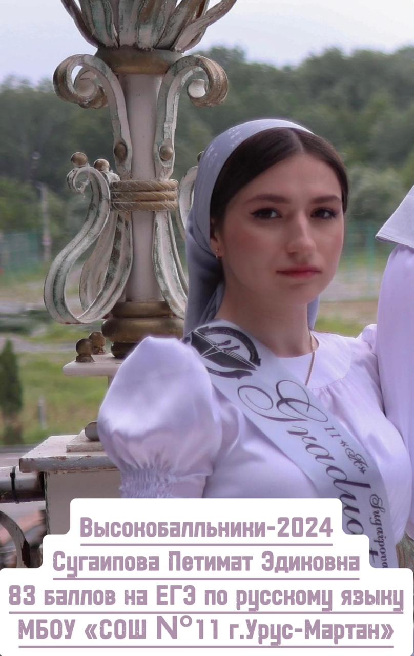 Высокобалльники-2024Сугаипова Петимат Эдиковна83 баллов на ЕГЭ по русскому языкуМБОУ «СОШ №11 г.Урус-Мартан»