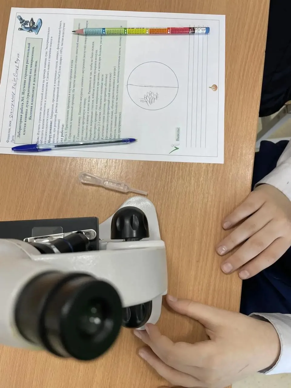 Сегодня мы погрузились в микромир! Цель работы была ясна: изучить строение растительной клетки, освоить технику приготовления временного препарата и закрепить навыки работы с микроскопом.